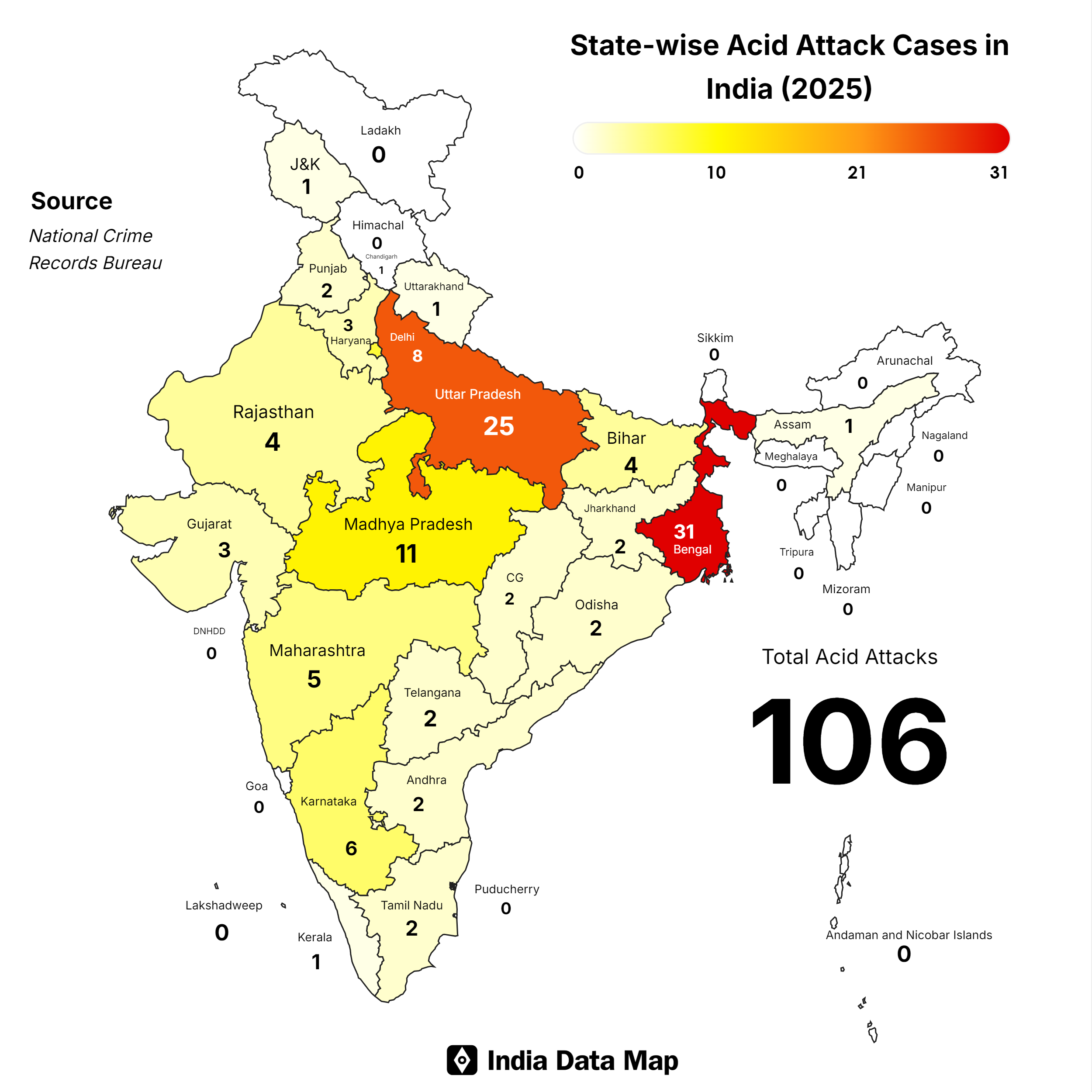 - High pendency: Due to systemic delays, 88% of acid attack cases were still pending in court as of 2025.