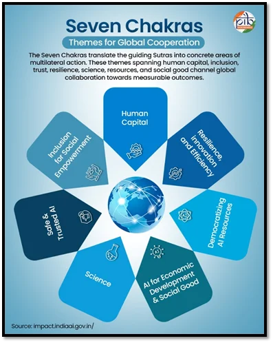- The Seven Chakras (Working Groups): Health, agriculture, science, inclusion, democratizing AI resources, safe and trusted AI, and economic development are some of the main topics.